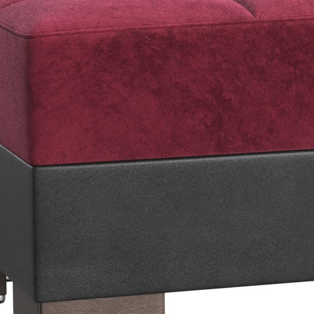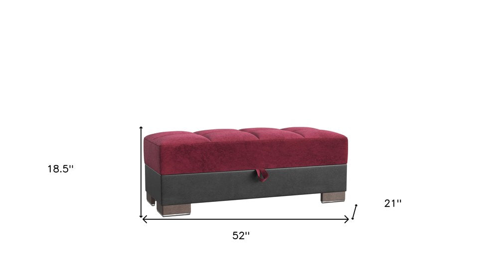 Practicality and fashion mix together with this handy 52-inch burgundy black and brown faux leather and microfiber tufted storage ottoman. Designed to discretely add hidden storage to your room without sacrificing seating or foot rest space. Expertly upholstered with padding in a soft solid color faux leather and microfiber, this ottoman is as comfortable as it is good looking. Ottomans are multi-functional additions to your space that add fashion and practical value. 18.5-inch h x 52-inch w x 21-inch d.