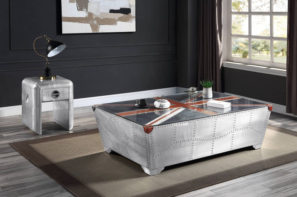 Add handsome, fashionable design to your living space with this 64-inch silver navy blue and red union jack aviator coffee table. The base of this table is made from manufactured wood this is clad with metal patchwork and rivets that resemble a vintage plane. The top features tempered glass with a Union Jack style British flag pattern that creates a unique and striking contrast to the silver of the base. This stylish rectangular table will be a great accent in any room if you're looking for something unique and different. 17.72-inch h x 64.00-inch w x 38.19-inch d.